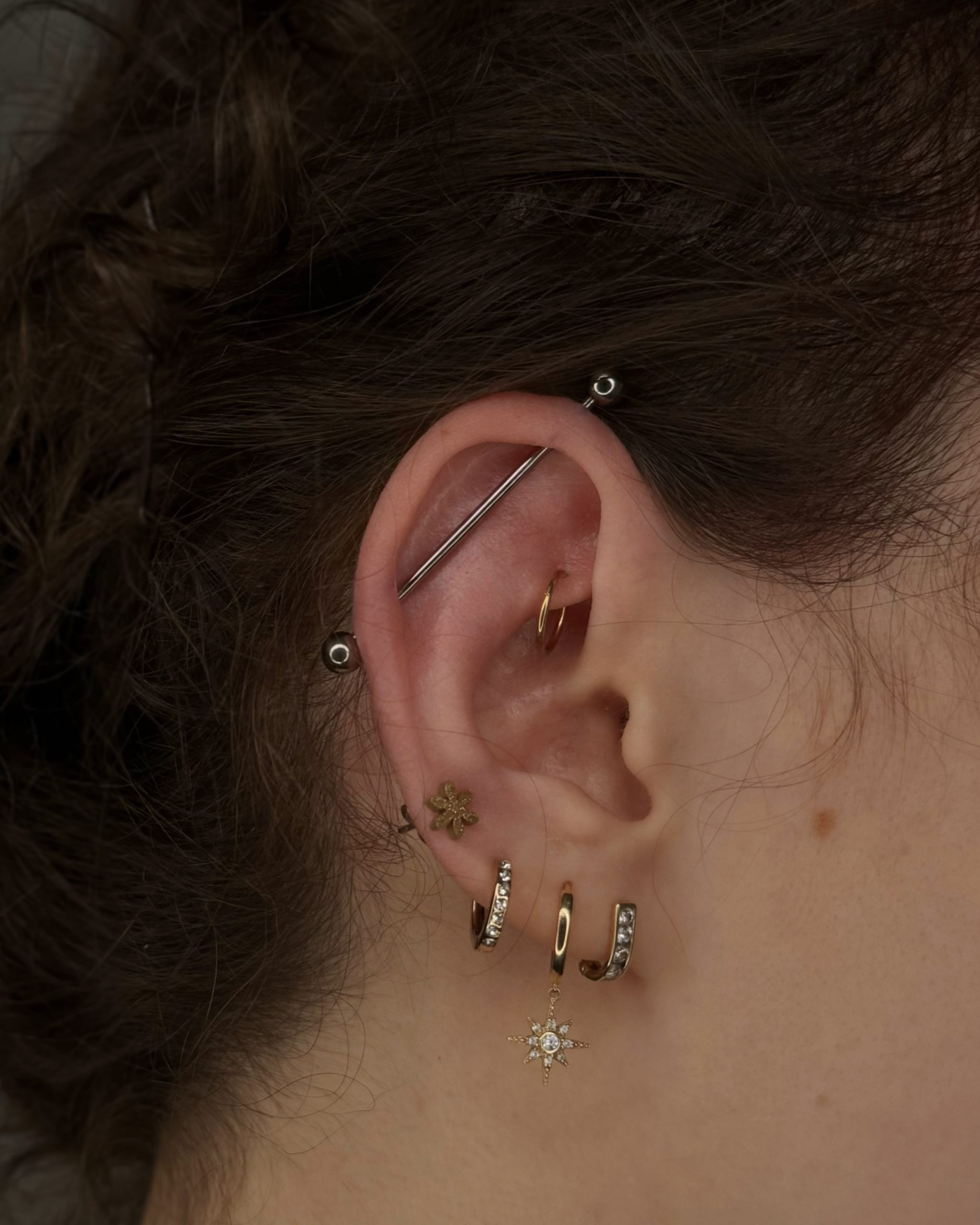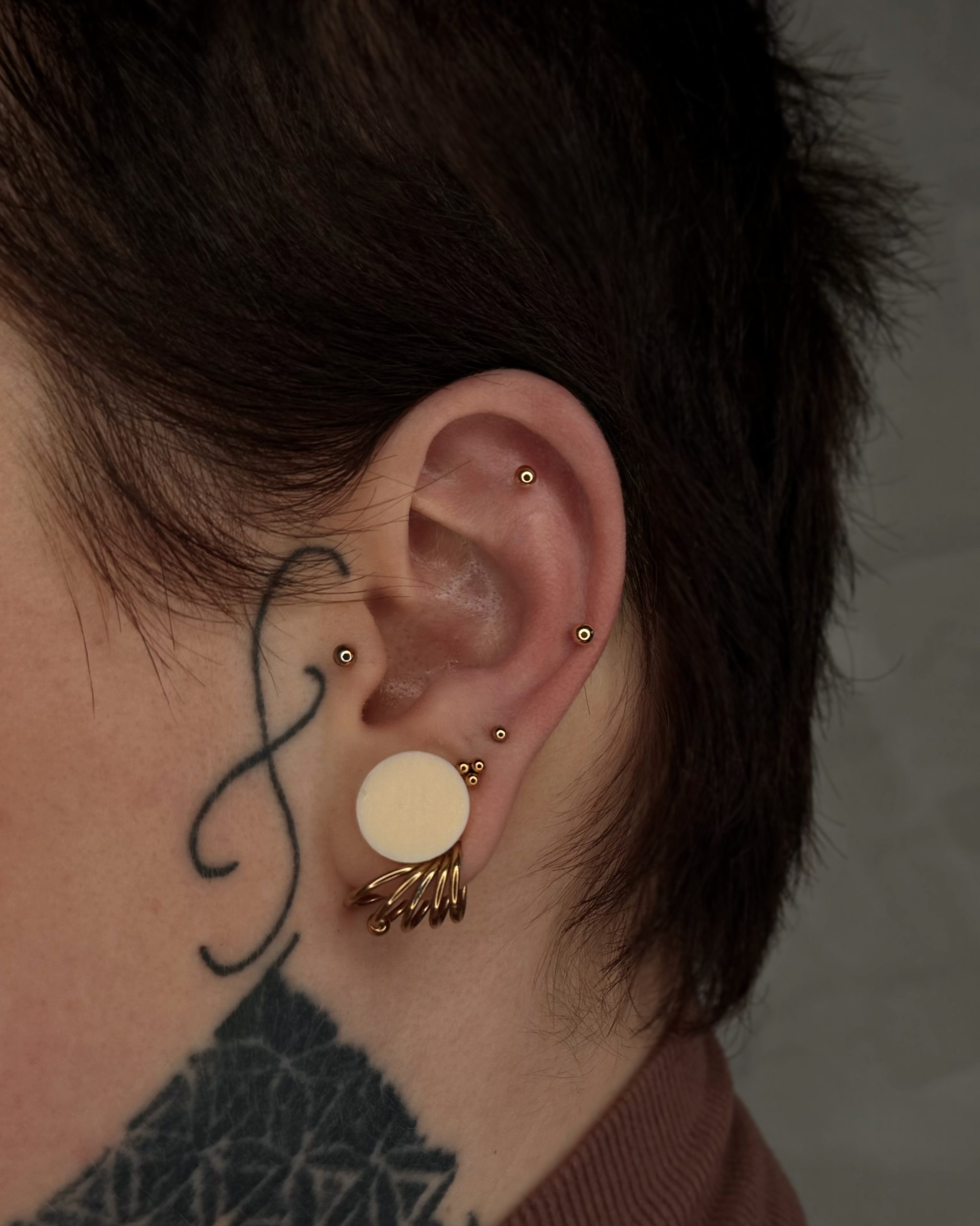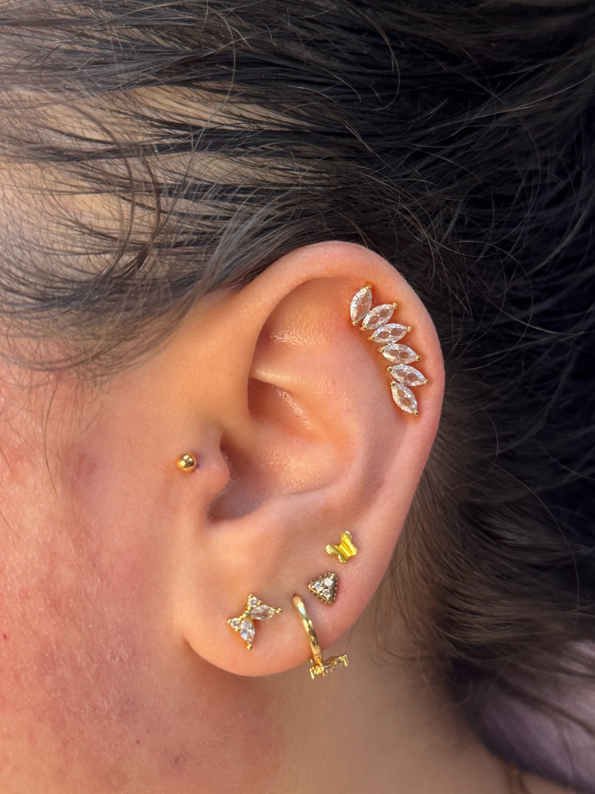 ✔ Piercing uszu – lobe, upper lobe, helix, forward helix, tragus, anti-tragus, rook, daith, conch, industrial.